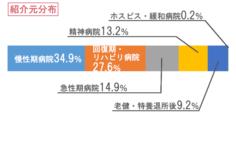 昨年は紹介元として回復期病棟が最も多くを占めていましたが、今年は慢性期病棟からのご紹介がそれを上回り、構造的な変化が見られました。今後は、こうした既存ルートに加えて、急性期病院から回復期・慢性期を経由せず、急性期から直接在宅へと円滑に移行できる受け入れ体制を強化することが重要と考えます。すなわち、地域包括ケアの本来の姿である「早期在宅復帰」を実現するために、急性期から在宅へのストレートな導線を確立していくことが、次の成長目標となります。当法人の体制が、総合診療をベースとして、その上に各科専門科医を配置した形が、我々独自で1.5次医療(造語です)が提供可能となることで、実現可能となると考えております。そうすると医療費を大幅に低減させることが可能となり、患者様ご本人にとっても住み慣れた家で暮らせる時間が増え、仮に高齢者施設に入居されている場合においても、昨今、種々の経費高騰で経営難に陥っている施設も多い中、空室日数を減らすことができれば、高齢者施設運営に携わる方々にとって一筋の光になるものと信じてやみません。この取り組みが、先述の入院日数の低減につながることでしょう。