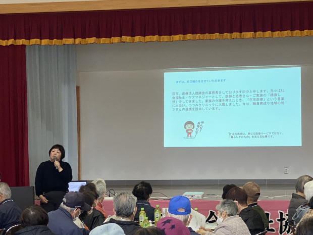 「知りたい‼在宅医療・介護のこと」というテーマでの講演で、約1時間、当院の理学療法士より簡単な体操も交えながら講演をさせていただきました。