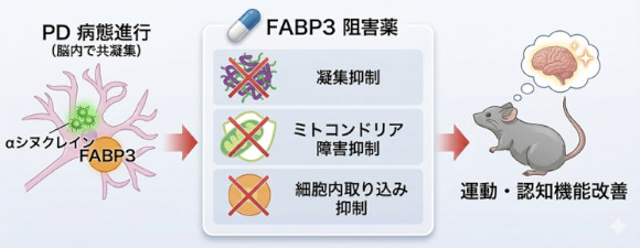 パーキンソン病の原因蛋白であるαシヌクレインがドパミン細胞に侵入するのを助けるタンパク質FABP3を阻害して、パーキンソン病の症状や進行を抑える治療です