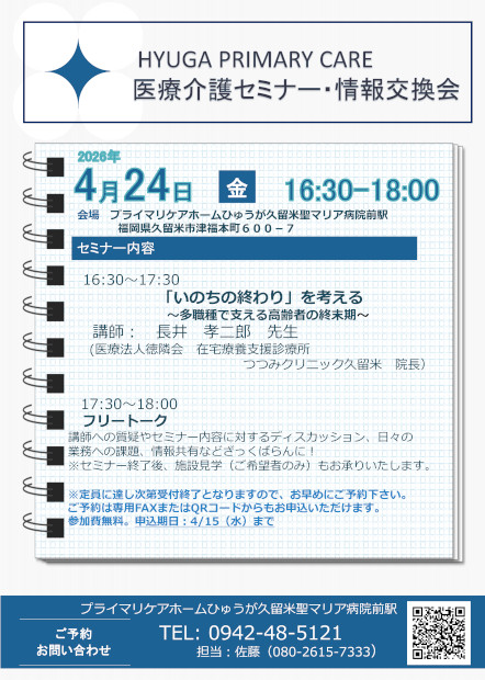 先週末の4月24日(金)、プライマリケアホームひゅうが久留米聖マリア病院前駅にて「HYUGA PRIMARY CARE 医療介護セミナー」が開催されました。
